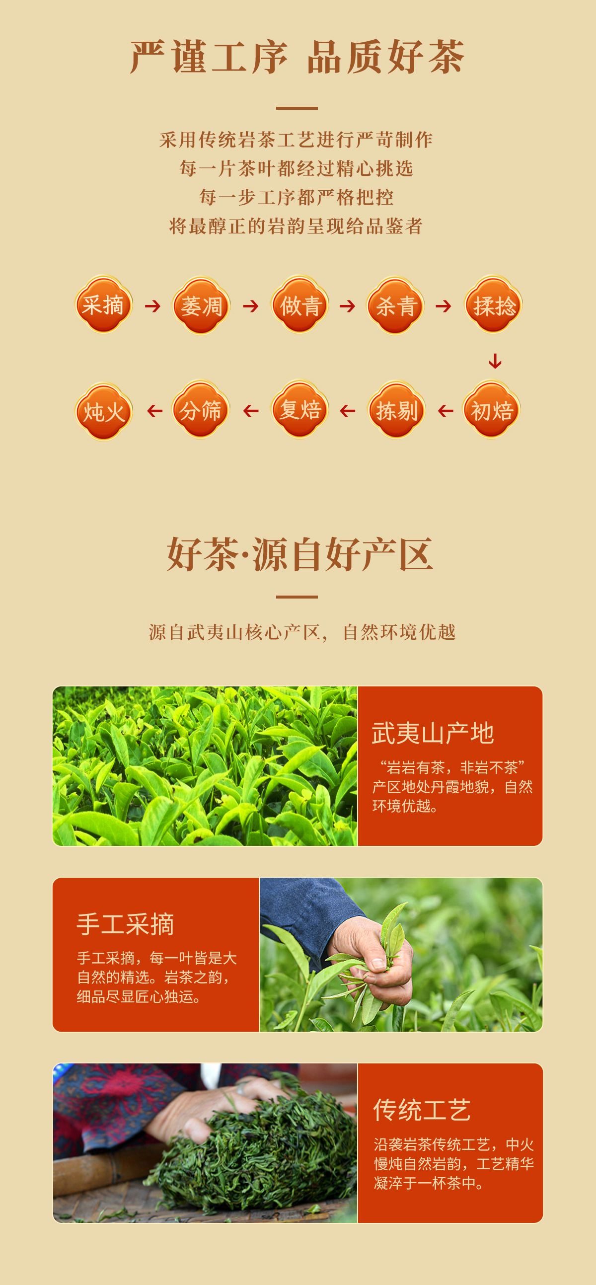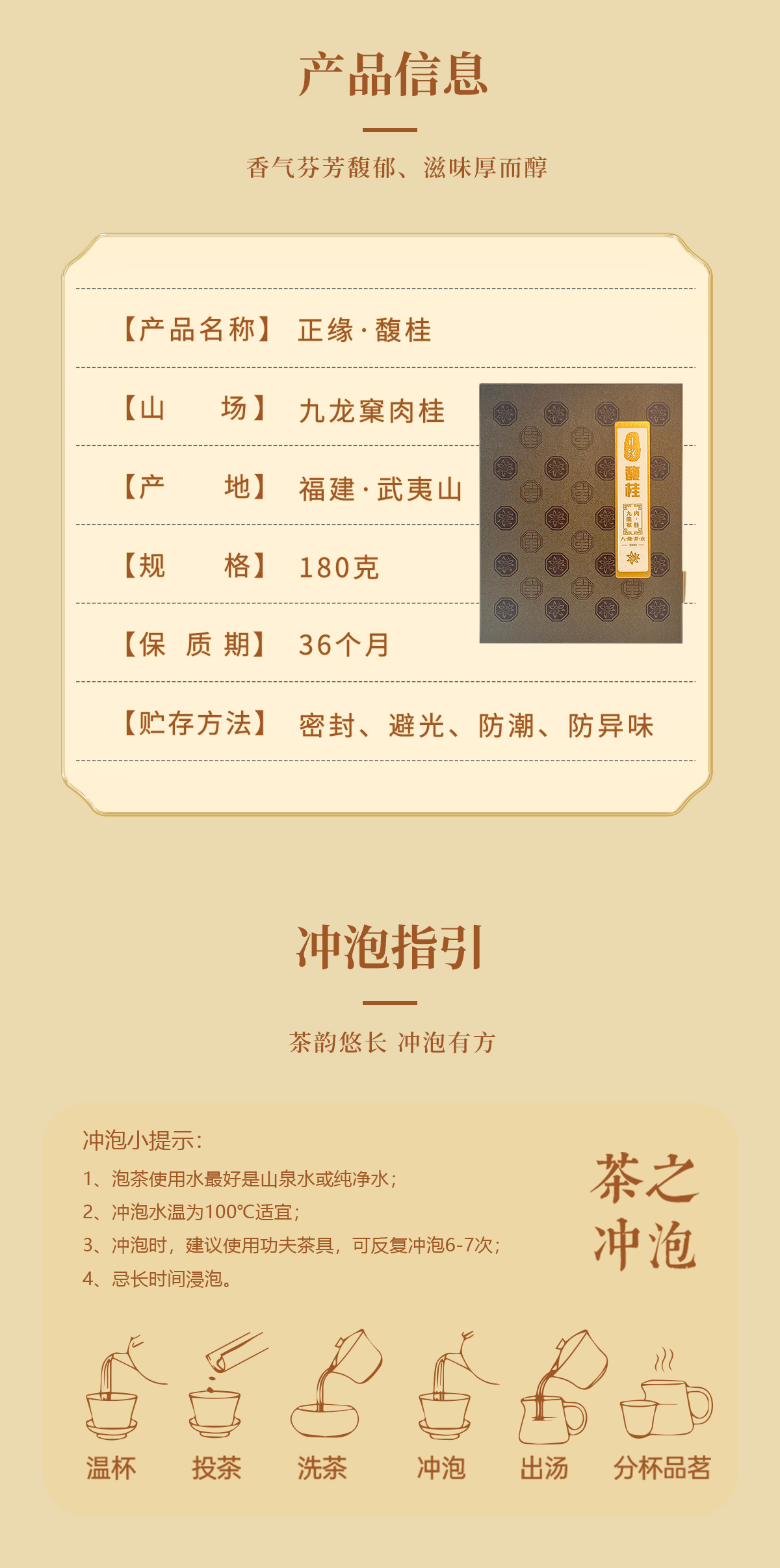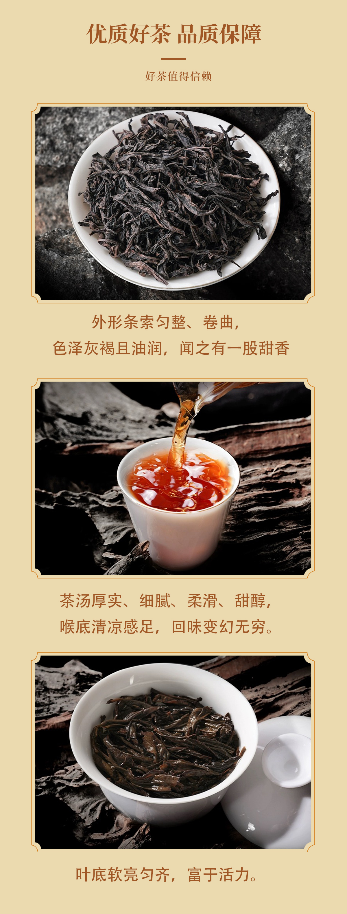 干茶条索壮结,匀整,光泽油润;汤色橙黄明亮;桂皮香持久,果香、花香层次明显;滋味醇爽细腻,厚实柔滑,甜醇,甘甜耐泡,岩韵显
