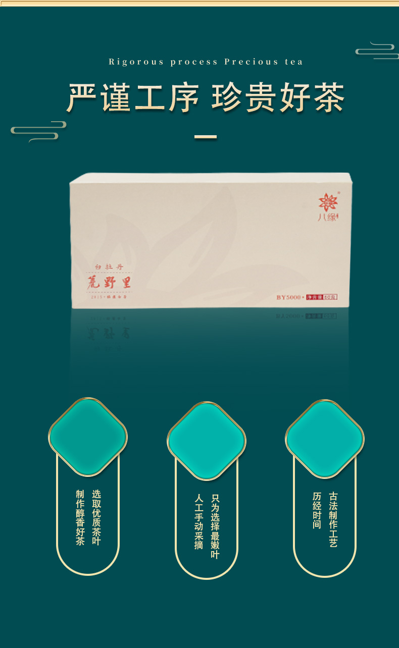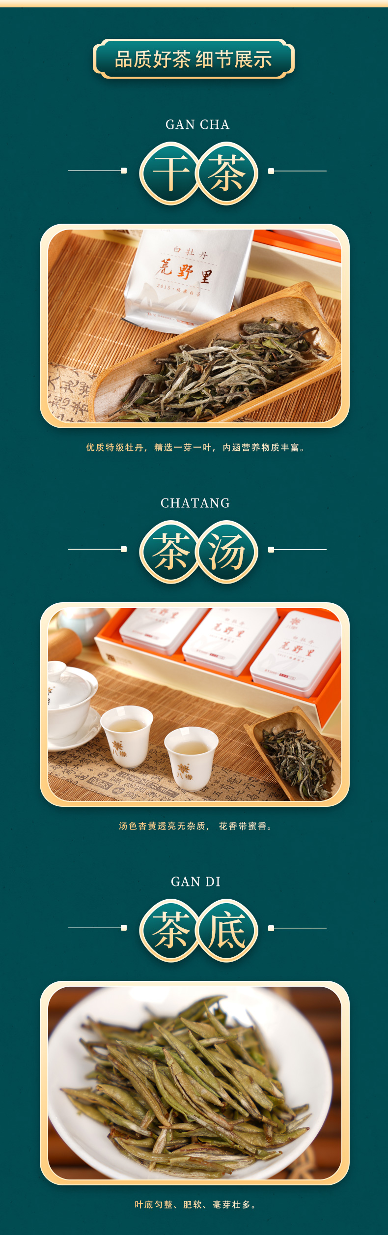 优质特级牡丹精选一芽一叶。 汤色:汤色杏黄透亮, 花香带蜜香。 口感:滋味饱满润滑爽口,回甘生津。